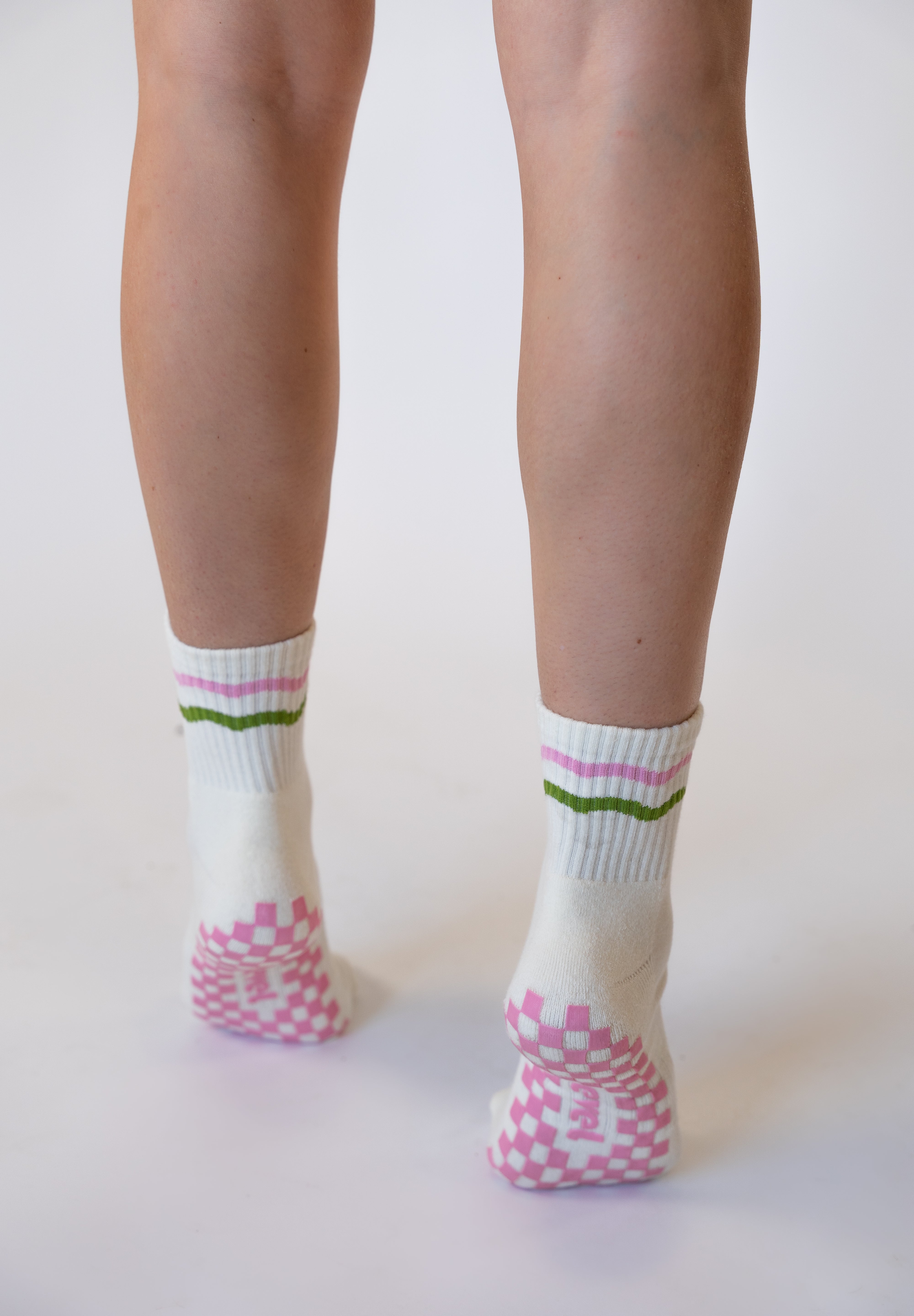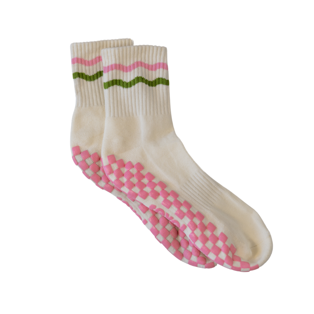 Serving vintage varsity vibes with a wink. Catch My Drift is your go-to grip sock for when you’re feeling cute but still mean business in class. The wavy pink and green stripes are a nod to retro style, while our signature grippy soles keep you locked in through every pulse, plank, and plié. She's breezy, she's bold, and she absolutely catches your drift.