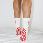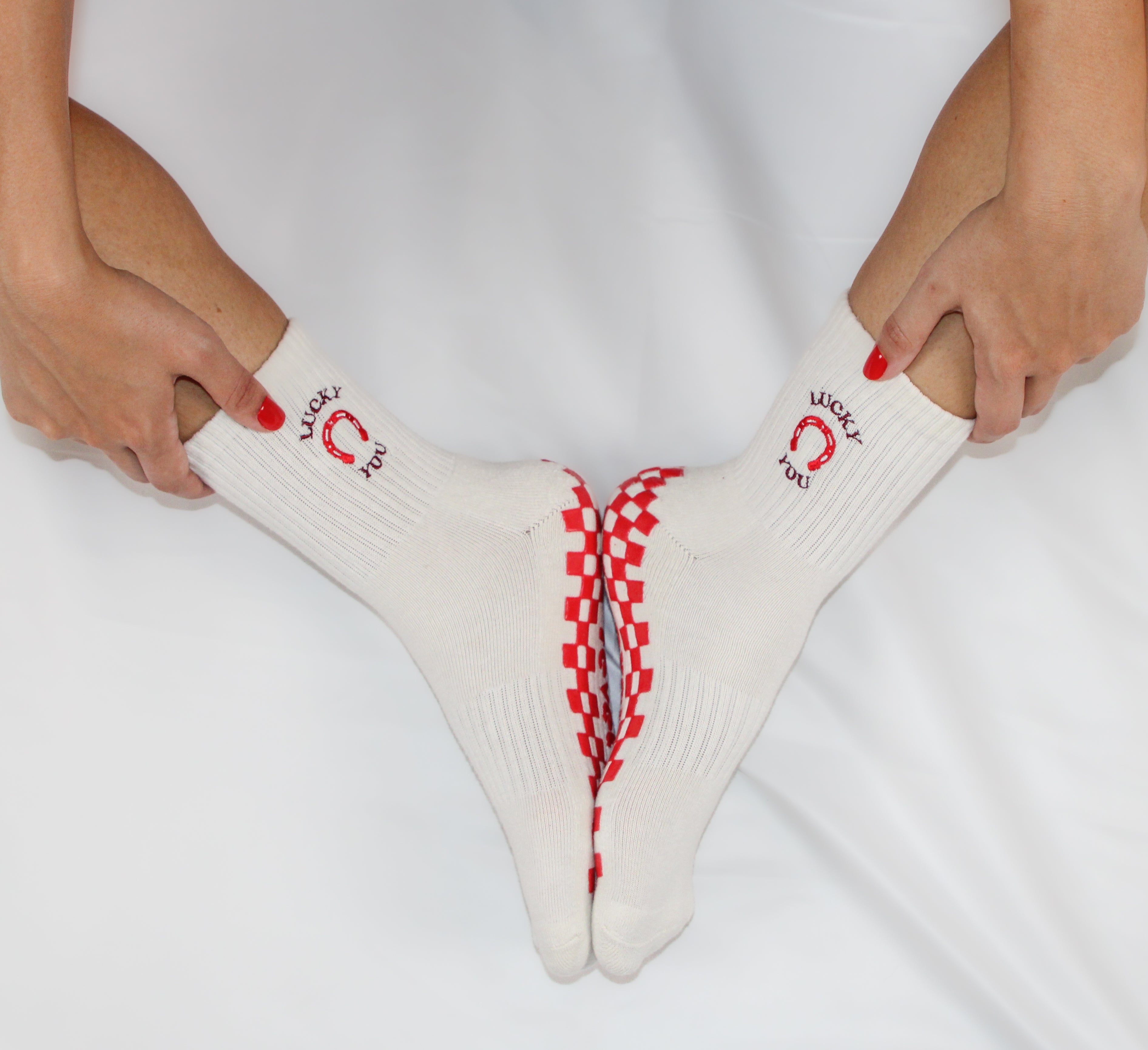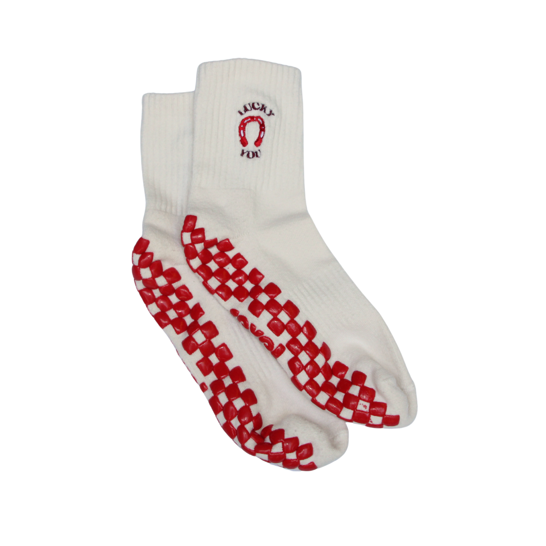 Grit, charm, and just a little bit of outlaw energy. The Lucky You tips its hat to vintage Western flair with a stitched horseshoe on the ankle and grips that hold tighter than a bull rider's knuckles. Equal parts cowgirl and cool girl, these socks were made for breaking a sweat (and a few hearts).